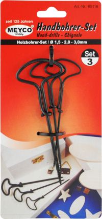 Ručna svrdla za bušenje različitih materijala. Koriste se za bušenje jesenskih plodova; kestena, žireva... za bušenje manjih rupica na drvenim podlogama za kukice, pante ili bravice. U pakiranju su 3 svrdla promjera 1,5, 2 i 3mm.
