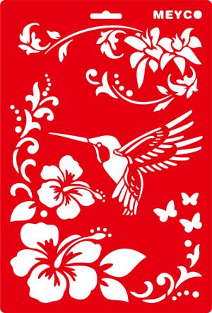 Šablona s cvjetnim motivima dimenzije 20x31cm. Izrađena je od izdržljive savitljive plastike, nakon pranja može se uvijek iznova koristiti. Može se koristiti na svim površinama, drvu, kartonu, tekstilu, plastici... Boje se preko šablona nanose specijalnim kistom, špahtlom, spužvastim valjkom ili kistom...