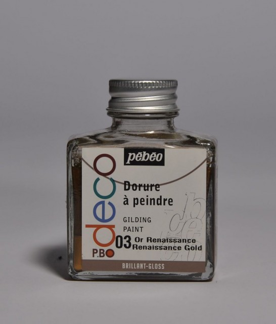 Boja za pozlatu francuskog proizvođača Pebeo u pakiranju od 75ml. Fina i dragocjena boja za pozlatu, nanosi se kistom na sve čiste i suhe površine (drvo, gips, karton, metal, plastika...). Daje profinjeni izgled svim dekoriranim predmetima.