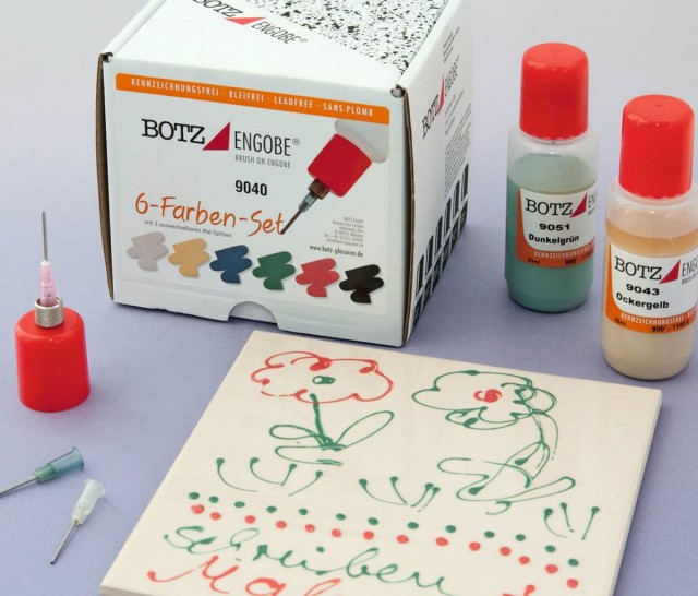 Botz engobe proizvod je renomiranog njemačkog proizvođača. Botz engobe pakirane su u plastične flašice sa aplikatorom (metalnom iglom) u tri različita promjera koja se razlikuju bojama, 1,2mm - roze boje, 1,5mm - prozirna i 1,8mm - sivozelene boje, te su time vrlo jednostavne za korištenje, a pogodne su i za rad sa djecom. Engobe se međusobno mogu miješati i po potrebi razrijediti vodom. Nakon dekoriranja, a prije paljenja, možete predmet glazirati prozirnom glazurom.