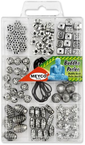 Metalne perle, raznih oblika s Buda motivima. U pakiranju je 17g perli u srebrnim tonovima i crna elastična špaga.