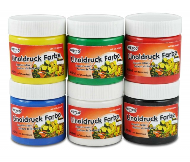 Boje za linorez na bazi vode. Mogu se međusobno miješati i lako se nanose kistom. Idealne su za školsku djecu koja se tek upoznaju s grafikom, studente i hobiste. Set sadrži 6 osnovnih intenzivnih boja crnu, bijelu, crvenu, plavu, zelenu i žutu po 40ml.