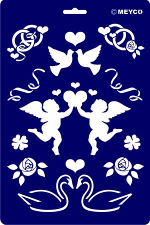 Šablona dimenzije 20x30cm. Izrađena je od izdržljive savitljive plastike, nakon pranja može se uvijek iznova koristiti. Može se koristiti na svim površinama, drvu, kartonu, tekstilu, plastici... Boje se preko šablona nanose specijalnim kistom, špahtlom, spužvastim valjkom ili kistom...